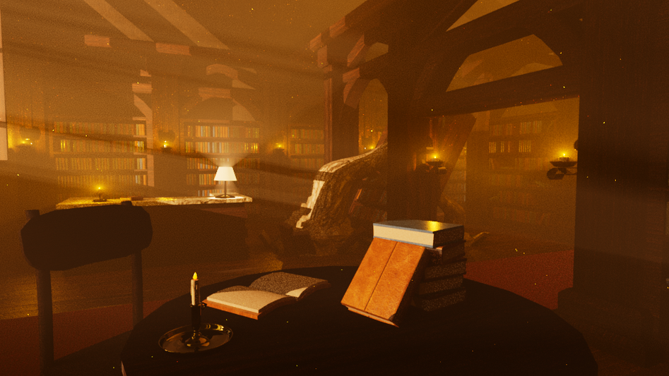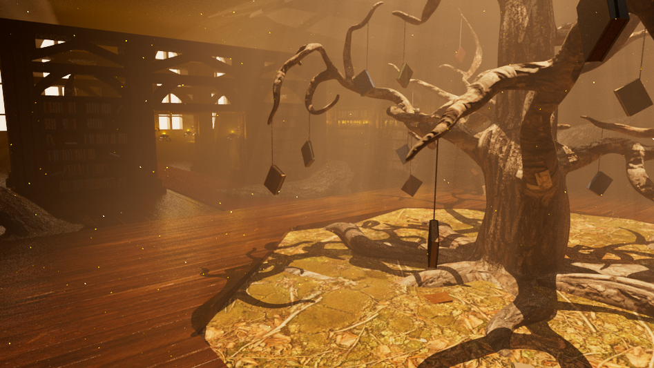 The somberly narrative involves an abandoned library that had been "taken over" by nature, evident through the broken structures held together by the roots. Books emerge from the centerpiece, a whimsical tree that situates at the back of the room and a glow envelops the enviornment through the warmth of the natural lighting and candles.
